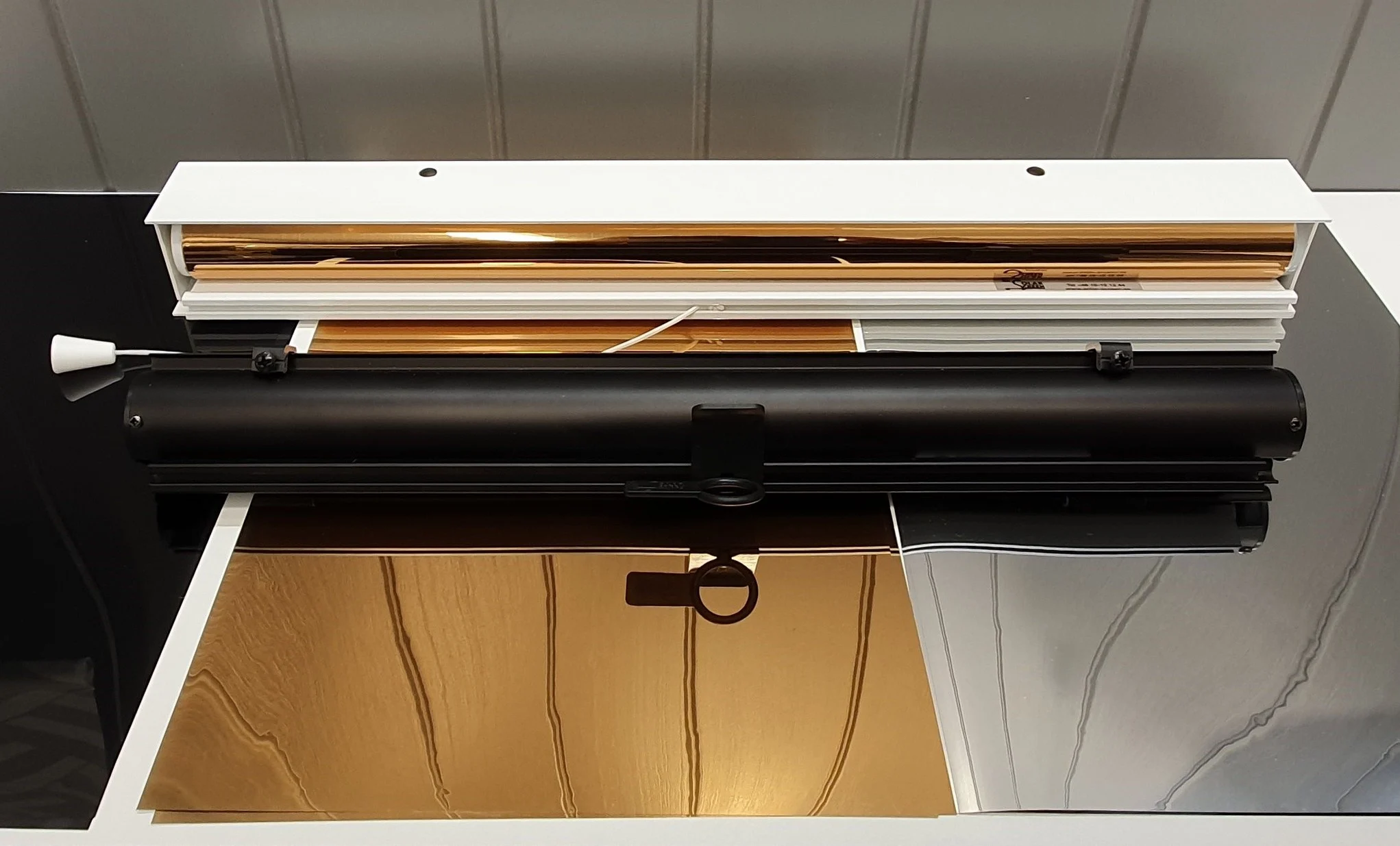 Solfilmsrullgardin lämpar sig inte för montage på foder då filmen lätt blir repig och skavd om den inte löper fritt.